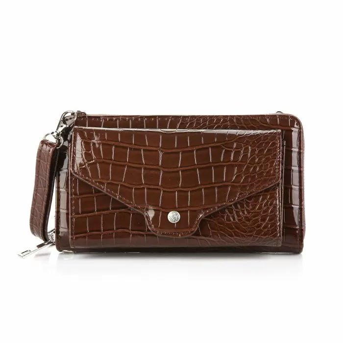 Elegant en functioneel: deze croco-geprinte portemonnee in glanzend donkerbruin is dé stijlvolle oplossing voor wie alles compact wil meenemen. Met een apart telefoonvak en afneembaar polsbandje is deze portemonnee ook perfect als clutch voor een avondje uit.