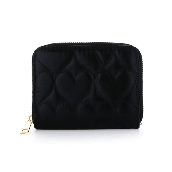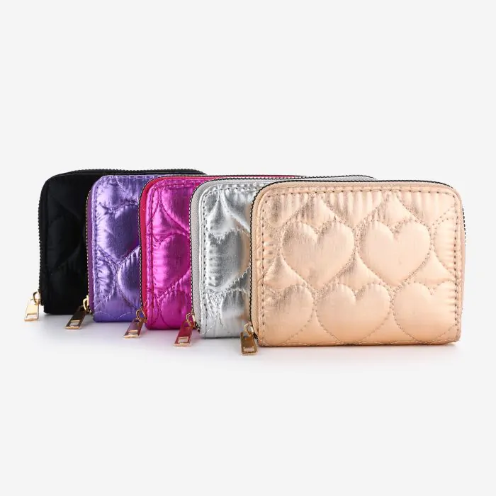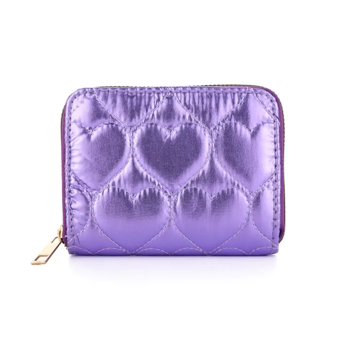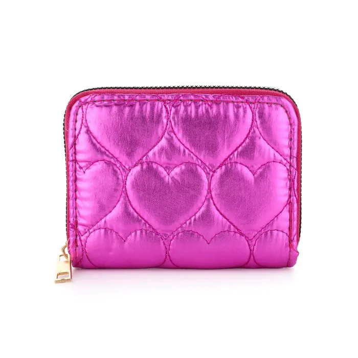 Val op met deze schattige en sprankelende portemonnee! De zilverkleurige metallic afwerking in combinatie met het doorgestikte hartjesmotief geeft dit accessoire een speelse en toch chique uitstraling. Ideaal voor wie graag wat extra glans toevoegt aan haar dagelijkse essentials.
