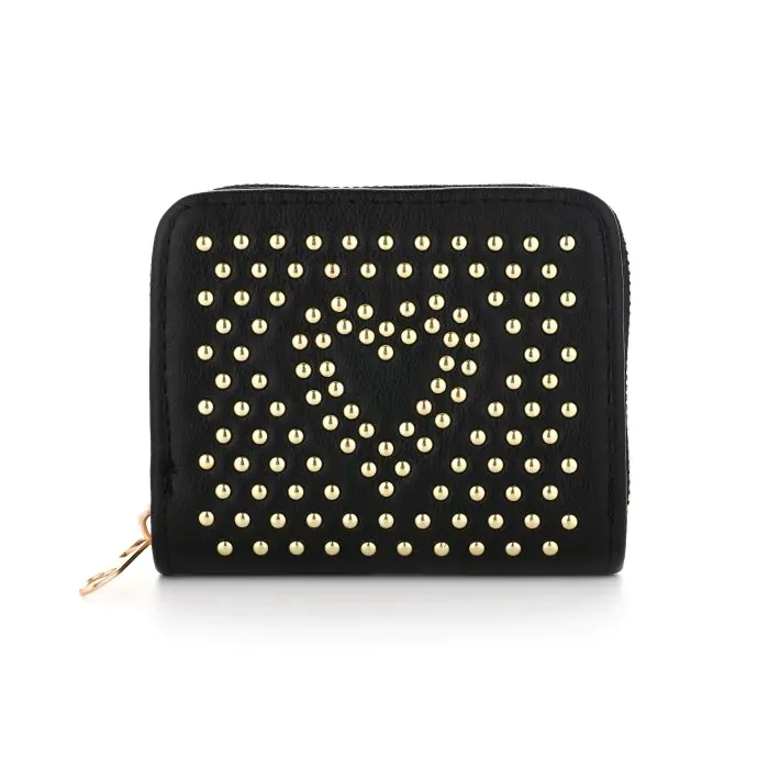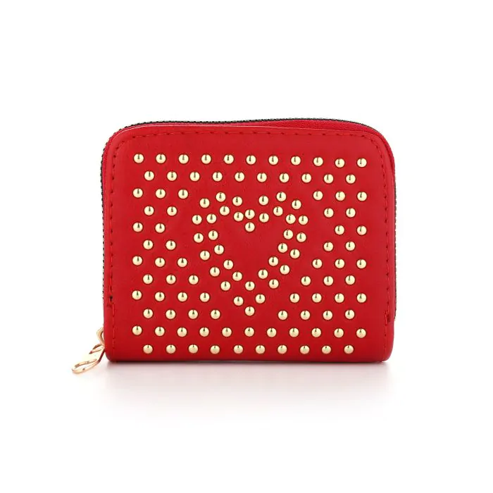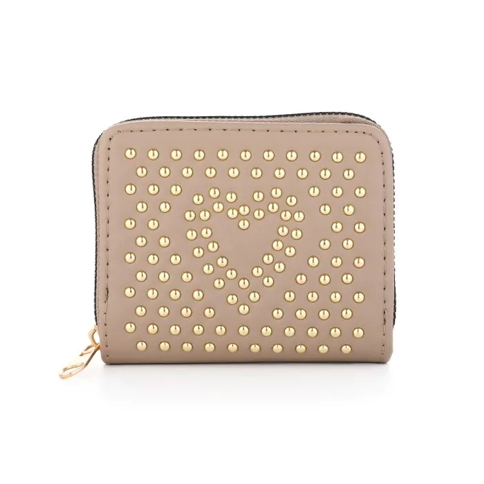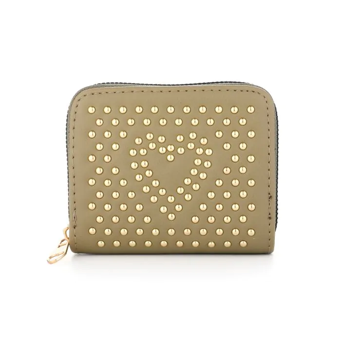 Een portemonnee die stijl en liefde uitstraalt! Deze witte portemonnee is afgewerkt met goudkleurige studs die samen een speels hart vormen op de voorkant. Het compacte model maakt het perfect voor dagelijks gebruik, zonder in te boeten op flair.