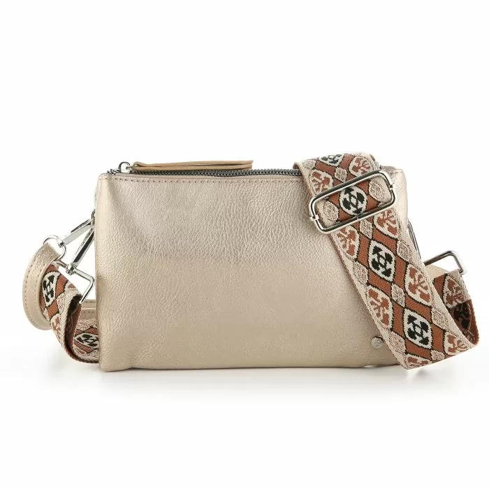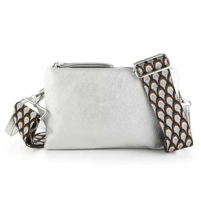 Deze zilveren crossbody tas straalt moderne elegantie uit met een futuristische touch. De tas heeft een minimalistisch ontwerp van glanzend metallic kunstleer en wordt stijlvol geaccentueerd door een brede, verstelbare schouderband met een opvallend bruin-wit patroon. Perfect voor wie houdt van een eyecatcher met praktisch gemak.