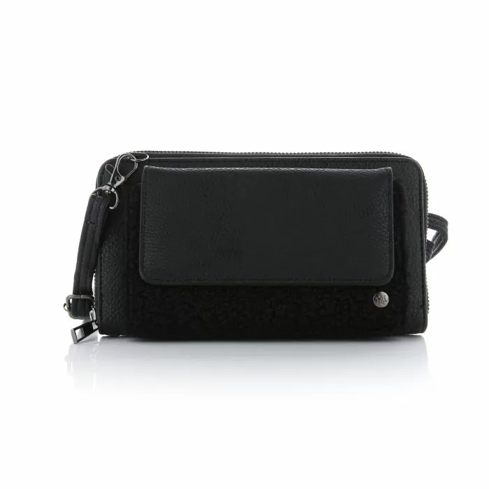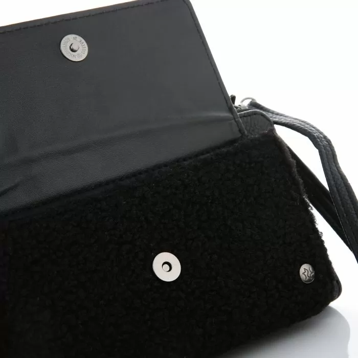 Trendy, zacht én praktisch – deze zwarte teddy portemonnee is een echte eyecatcher! Het speelse teddy materiaal wordt gecombineerd met glad kunstleer voor een moderne look. Dankzij het aparte telefoonvak, ruime opbergruimte en handige polsbandje is deze portemonnee ideaal voor onderweg.